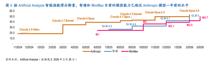 模型迭代方面,预期节奏约为每年推出一代旗舰模型(如 GLM 4.7 到 GLM 5,MiniMax M2 系列到 M3 系列),中间伴随强化学习驱动的小幅升级,停止迭代意味着失去竞争地位。