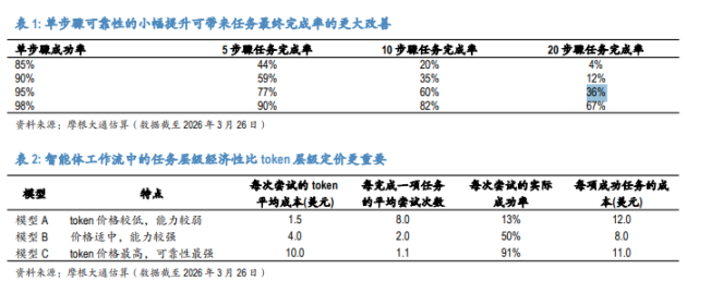 在多步骤工作流中,客户购买的本质不是「廉价 token」,而是「任务顺利完成」。研报给出了一个直观的数学例子:若单步骤成功率从 85% 提升至 98%,一个 20 步骤任务的最终完成率将从 4% 跃升至 67%。在这种逻辑下,每 token 定价最低的模型,其完成每项任务的实际综合成本反而可能最高。