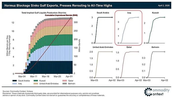 最新的重大变量来自伊拉克豁免声明。伊朗军方发言人在国家通讯社伊斯兰共和国通讯社(IRNA)发布的视频声明中表示,"兄弟之国伊拉克"免于伊朗对霍尔木兹海峡施加的任何限制,相关限制仅针对"敌对国家"。若豁免得以落实,理论上可释放多达每日300万桶的伊拉克石油货运量。