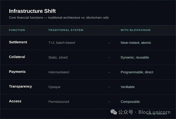 然而,如今金融业正面临着一个金融史上的根本真理。基础设施是开展活动的必要前提,但资产负债表决定了谁能攫取经济利益。仅仅拥有一条更快或更透明的轨道,本身并不能改变市场的重心。基础设施解决了机构如何参与的机械性问题,但对于谁能攫取价值这一更为重要的问题,它却无所作为。在基础设施建设蓬勃发展的年代,后者的答案依然固守传统。