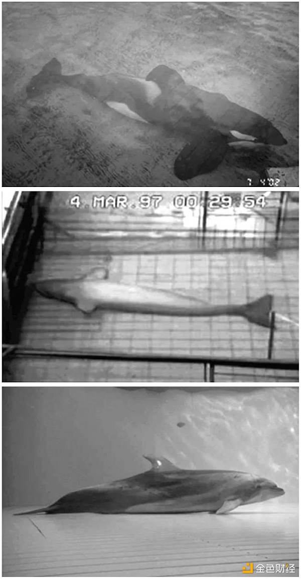 虎鲸、白鲸和宽吻海豚在池底休息的情景|图片来源:National Library of Medicine(United States)