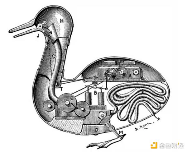 就像这只 「消化鸭」 机械自动装置,能够模仿生物行为,但所有动作都是预先编写好的