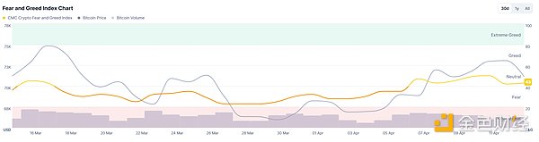 加密市场的大反弹仍遥遥无期。4 月 13 日,BTC 价格徘徊在 71000 美元附近,24 小时内下跌约 2.6%,ETH 表现更弱,下跌 3.63%,报约 2200 美元。比特币市值占比仍在 58.8%,整个加密板块成交量并未显著放大。