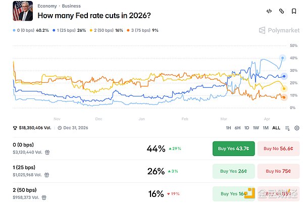 目前 Polymarket 上最新数据显示,市场押注今年美联储降息 1 次 25 个基点的概率仅为 26%,而按兵不动的概率升至 44%。