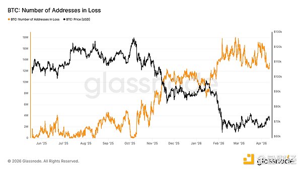 目前,当 BTC 价格处于 7.08 万美元时,处于亏损状态的地址数量约为 1350 万个。