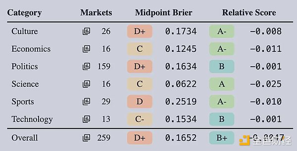 0.044 这个分数是 Polymarket 所有上架商品的平均值。而在这个案例中,平均值起到了至关重要的作用。如果根据人们实际投注的内容来细分分数,就会发现评分波动很大。