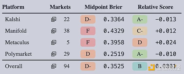 然后是体育。所有平台上的体育预测市场总分仅为0.325,也就是-D。要知道,抛硬币的概率是0.25。体育预测市场的表现,总体而言,还不如直接抛硬币来预测每个问题。好好想想吧。