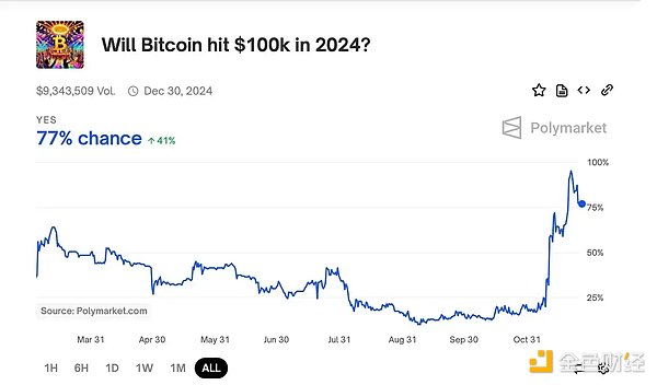 Polymarket 曾推出一个关于比特币是否会在 2025 年 1 月前达到 10 万美元的市场。比特币最终确实达到了 10 万美元。市场预测的结果是正确的,但它在大部分时间里都错误地评估了概率,几个月来一直处于低置信度状态,直到最后阶段才飙升至接近确定的水平。它的 Brier 评分是 0.4909,也就是 F。记住,在 0.25 之后(相当于抛硬币的概率),你还不如直接随机猜测。而这个市场的 Brier 评分几乎是这个值的两倍。