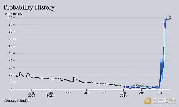 关于卡玛拉·哈里斯赢得2024年民主党总统候选人提名的市场走势更加疯狂。她最终赢得了提名,而市场也再次预测对了结果,这颇具讽刺意味。但布里尔指数仅为0.9098。这个数字糟糕透顶,怎么强调都不为过。市场长期以来都自信地错误预测,以至于即使最终结果正确也无法挽救它。如果你一直以这个市场作为决策依据,那么在整个竞选周期中,直到最终结果尘埃落定的那一刻,你都会被误导。