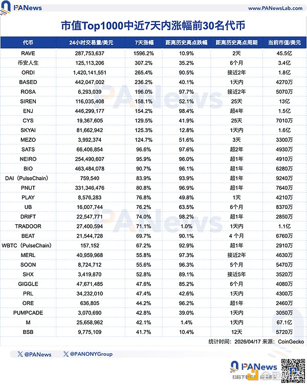 根据 CoinGecko 追踪的市值 Top1000 代币数据显示,过去 7 天,涨幅前 30 名的代币平均涨幅达到 153.5%,显著跑赢比特币、以太坊和 Solana 等主流资产,主要集中在 Meme、铭文、AI 和基础设施等赛道。