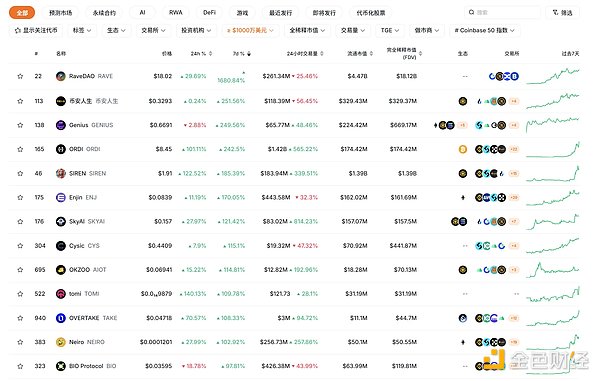 如果把时间周期放到 1 个月,最高涨幅达到10倍的项目则至少有 3 个,分别是 RAVE、ARIA、币安人生。