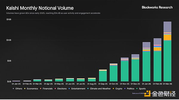 Kalshi 过去一年经历了快速增长,月度名义交易总量从 2025 年初的 1.8 亿美元增长了 80 倍,达到 2026 年 3 月的 144 亿美元。月均交易量增长率达 40%,反映出用户参与度的提高以及交易活跃度的提升。
