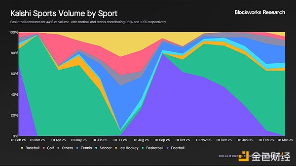 自 10 月以来,篮球赛事一直占据交易量榜首,近期举行的 NCAA(美国全国大学体育协会)男子篮球锦标赛就创造了 15 亿美元的实际交易量和 33 亿美元的名义交易量。这与 2026 年美国人在“疯狂三月”期间估计投注的 33 亿美元相当,凸显预测市场日益重要的作用。