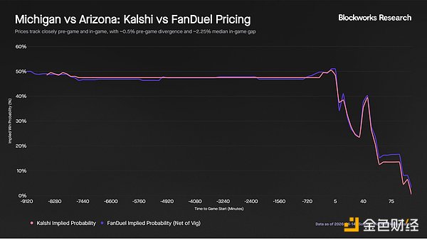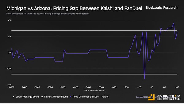 值得注意的是,下半场的价格差异具有方向性,随着密歇根扩大领先优势,FanDuel 对亚利桑那的定价始终高于 Kalshi。这表明,在比赛势头强劲的阶段,Kalshi 能更快地整合比赛内信息。