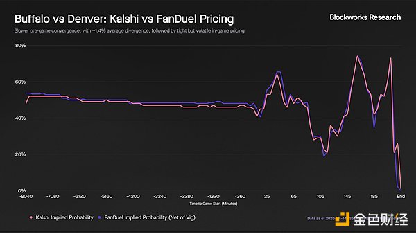 比赛开始后,价格再次紧密联动,相关性为 0.9738。这场比赛异常激烈,多次交替领先,胜率出现大幅波动,其中包括布法罗队在加时赛后期胜率一度达到 74%,但最终丹佛野马队赢得了比赛。