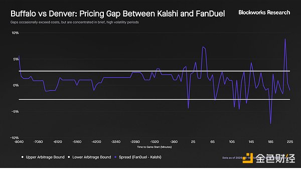 赛前定价并未立即出现趋同现象。开赛前五天,两个平台的预测结果相差 5.7%,FanDuel 预测布法罗的胜率是 53.7%,Kalshi 预测是 48%。接下来的一周,两个平台的预测结果都逐渐调整,没有一方始终领先。到开赛时,两个平台对布法罗的胜率预测都接近 48%。赛前平均差异为 1.40%,是 NCAAB(美国大学橄榄球联盟)类似案例的两倍多,表明早期共识较弱。