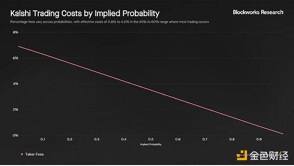 FanDuel 的赔率已扣除佣金,佣金相当于每方约 2% 的入场成本。在 Kalshi 平台上,手续费会根据合约概率而变化,在 50% 左右的概率水平上绝对值最高,对于吃单者而言,手续费约为 3.50%,对于挂单者而言,手续费约为 0.88%。由于大多数场内交易发生在 40% 到 60% 的概率范围内,Kalshi 平台的实际交易成本在 2.8% 到 4.2% 之间,与传统体育博彩平台相比,其成本相当,甚至在某些情况下更高,尤其对于吃单者而言。