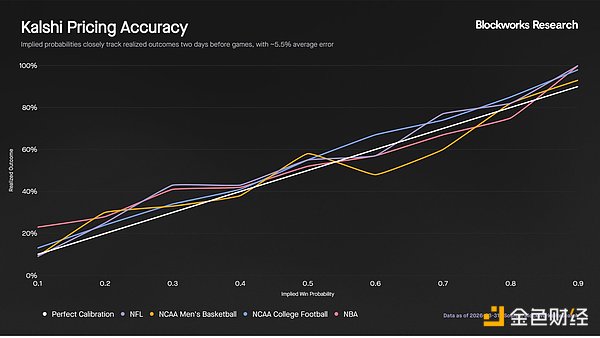 比赛开始前两天,Kalshi 价格是预测比赛结果的有力指标。平均而言,隐含概率与实际结果的偏差为 5.5 个百分点。在分析的四个联赛中,NCAA 大学橄榄球的预测准确率最高。