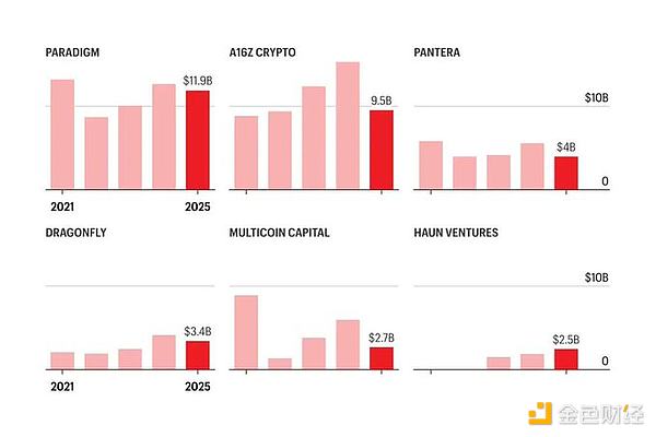 唯一逆势增长的是 Haun Ventures,一家成立仅 4 年的风投基金,其资管规模从最初的 10 亿美元逐年增长至 2025 年的 25 亿美元。