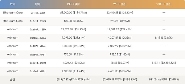 表 1:攻击者在 Aave 两个市场上的 rsETH 供应与 WETH/wstETH 借出明细
