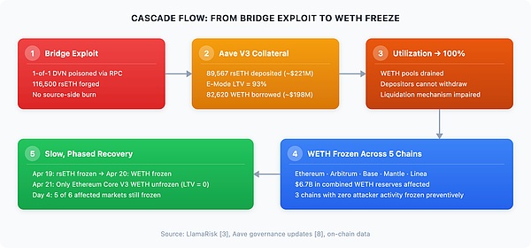 攻击者集中在 Ethereum Core 和 Arbitrum 进行借款操作。但关键观察在于那些攻击者从未触及的链上发生了什么。由于 rsETH 在 Mantle、Base 和 Linea 上被接受为抵押品,一旦底层桥接支撑被破坏,这些链上任何以 rsETH 为抵押的现有用户仓位都面临潜在的坏账风险。Aave 决定在所有五条链上预防性冻结 WETH 是合理的应对:如果保持这些市场开放,它们将暴露在攻击者已在 Ethereum 和 Arbitrum 上验证过的同一抽取机制之下 [3, 8]。