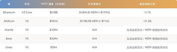 表 2:各链 Aave V3 市场 WETH 储备规模与攻击者直接抽取比例