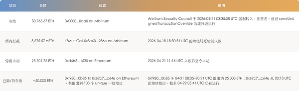 在 Aave 处理借贷级联的同时,Arbitrum 上也在进行一场平行的响应行动。4 月 21 日,Arbitrum Security Council 宣布采取紧急行动,冻结了攻击者在 Arbitrum One 上持有的 30,766 ETH [6]。这些资金被转移到一个中间冻结地址(0x...0DA0),只有通过后续的 Arbitrum 治理投票才能处置 [7]。