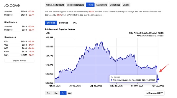 据链上分析师余烬监测,截至4月23日上午,Aave TVL 已跌破 300 亿美元,从事件前的 458 亿美元降至 296 亿美元,流出金额达 162 亿美元,跌幅超过 40%。