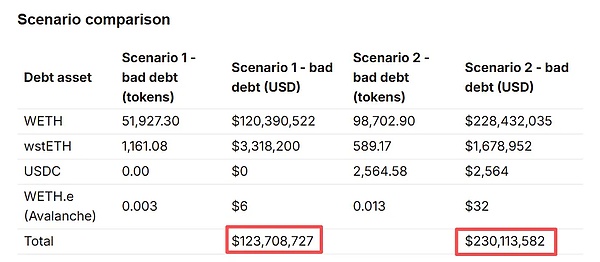 这批无抵押的 rsETH 被当作合规抵押品接受,借出的真实 WETH 却无法被等价覆盖,导致 Aave 面临最高 2.301 亿美元的坏账敞口。