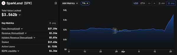 没有人预料到,这场 Aave 坏账风波最大的短期受益方竟是 Spark。资金从 Aave 大规模出逃后,部分直接流入 Spark。最新 DefiLlama 数据显示,其 TVL 已从事件前的约 19 亿美元快速升至 33-35 亿美元 级别(增长超过 80%),部分归因于孙宇晨等大户的持续注入。