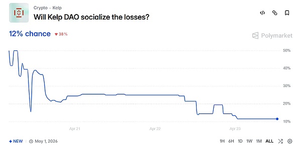 双方至今未达成明确的责任划分或补偿框架,Polymarket 最新数据显示,市场押注“Kelp 将分担损失”的概率已从事件初期的 50% 进一步降至约 12%。
