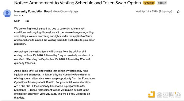 Humanity 基金会近期针对投资者的 $H 代币归属计划进行了重大调整。原定于 2026 年 6 月 25 日启动、分 6 个季度发放的解锁计划,现被要求在 4 月 26 日UTC 09:00 前回复邮件,在以下两个方案中做出最终选择:一、延长发放方案,2026 年 9 月 25 日启动解锁,延长至 12 个季度等额发放。二、3:10 缩减比例即时解锁,以 5,000,000 枚 $H 替代原有的 16,666,666 枚 $H(70% 减),于 2026 年 6 月 25 日一次性全额发放。目前,已有早期投资机构 Trix Ventures 公开披露选择折价即时解锁方案。据悉该机构于项目约 6000 万美元估值阶段投资,即便经 3:10 折价置换后仍可实现约 7 倍回报。
