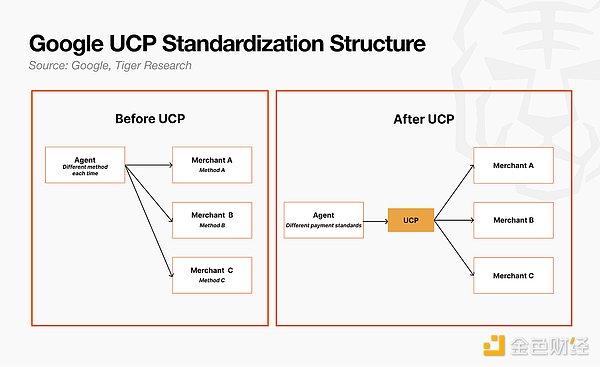 代理要代表用户处理购物,就必须与各种不同的服务进行无数次交互。问题在于,每个服务的结构都各不相同。每次代理发现一项新服务并发起交易时,都需要单独进行集成。谷歌旨在通过统一通信平台 (UCP) 消除这种低效。