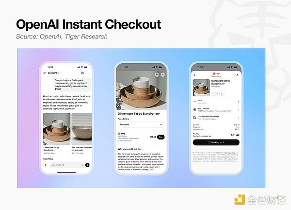 2025年9月,OpenAI推出了Instant Checkout,可在ChatGPT内完成支付。该方案对Shopify商家收取4%的交易费。然而,实时库存同步、税务处理基础设施的不足以及较低的转化率阻碍了其发展。