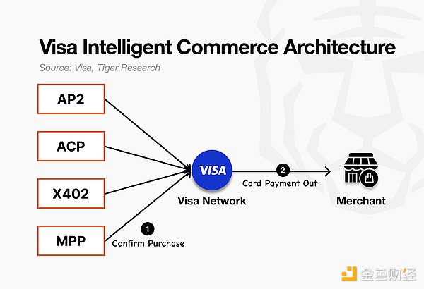 Visa 曾致力于构建一个独立的生态系统,拥有自己的可信代理协议和智能商务平台。其策略是“使用我们的标准”。然而,随着 MPP 的推出,Visa 也加入了 MPP,成为其卡轨扩展合作伙伴。Visa 加密货币主管 Cuy Sheffield 评论道,Visa “将 MPP 视为明确定义代理商和商户沟通方式的另一种途径”。