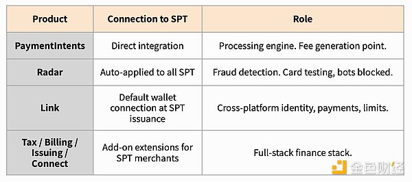 Stripe 的独特之处在于,它将 SPT 设计成一个枢纽,而非简单的支付代币,代理支付由此进入 Stripe 生态系统。一旦商家采用 SPT 接受代理支付,其背后的 Stripe 产品就会捆绑在一起。打开一扇门,四扇门便会连接起来。
