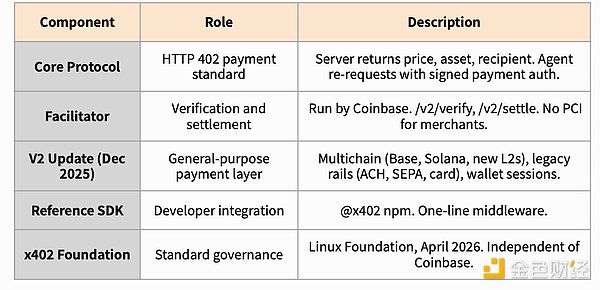 首先,Coinbase 的 x402 协议与 x402 之间存在着标准的竞争关系。Coinbase 的 x402 协议已经积累了超过 1 亿笔支付交易,并通过将其移交给 Linux 基金会确保了其中立的治理结构。Stripe 也加入了 x402 基金会成为合作伙伴,这是一种双管齐下的策略,但这两个协议能否长期共存或最终合并,目前尚不明朗。