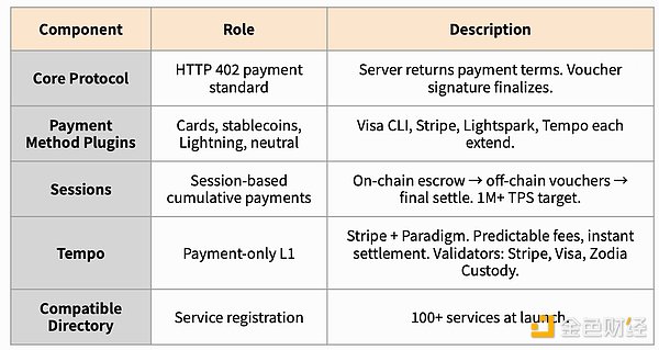 x402 仅支持稳定币,而 MPP 支持银行卡、稳定币和比特币闪电网络,构建了多样化的支付方式。Tempo 的初始设计合作伙伴名单揭示了该市场的特点。Anthropic、OpenAI、德意志银行和 Visa 均已加入。MPP 自身的协议扩展由 Visa(银行卡)、Stripe(银行卡和钱包)以及 Lightspark(闪电网络)实现。