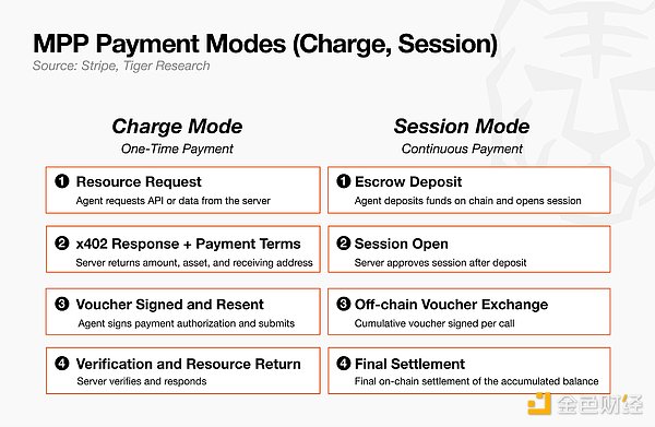 这两种模式在流程可视化中形成了鲜明对比。一次性支付(Charge)的流程类似于 x402,通过单笔链上交易完成。而连续支付(Session)仅在初始充值和最终结算时进行两次链上记录,中间的 N 次调用均通过凭证在链下处理。
