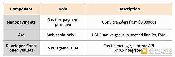 当这三项技术捆绑在一起时,代理商可以在 Circle 的技术栈中获得完整的支付体验:USDC 发行 (USDC) → 支付轨道 (Nanopayments) → 结算链 (Arc) → 钱包管理 (Wallets)。