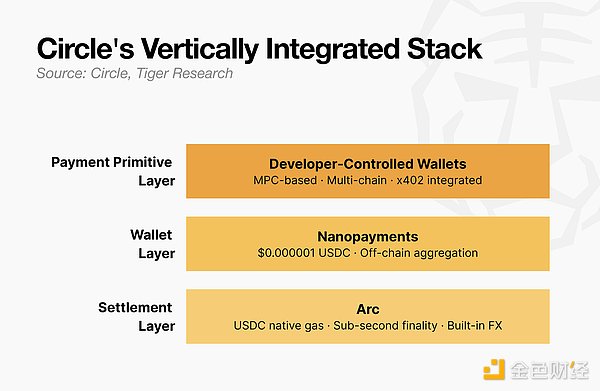 Circle 最初是一家以 USDC 发行方身份起家的公司,如今已发展成为一家业务遍及整个稳定币基础设施的公司。在代理支付时代,USDC 不再仅仅是一种支付方式。Circle 选择了一种全栈式战略,将支付原语、钱包和结算链垂直整合到自己的技术栈中。