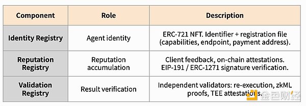 ERC-8004 由三个链上注册表组成。