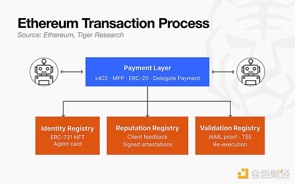 以太坊提供了支付层必须共同依赖的信任层。代理的身份、信誉以及其工作结果是否经过验证等信息都以标准化的形式记录在链上。无论最终哪个支付协议胜出,这些交易的信任证明都将通过 ERC-8004 进行验证。