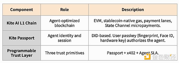 Kite 的核心由四个要素构成:兼容 EVM 的 L1 链(稳定币原生结算)、Kite Passport(代理身份和委托管理)、可编程信任层(加密支出规则)以及 SLA 执行层。Kite 与其他同类产品最大的结构区别在于,这些要素并非独立产品,而是作为一个整体运行。