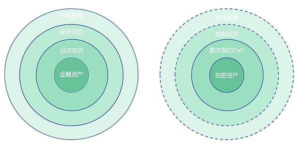 至此,加密行业从加密货币(资产)出发,发展出了去中心化金融(各种基于区块链的智能化数字合约),但未发展出一个规模化的加密数字经济,更别说对现实经济和对社会存续发展的现实意义。笔者曾在以往的文章中(见附录 1),对货币、资产、金融、经济以及社会发展的相互关系进行过梳理,这里不详细展开,但它们相互之间的关系,可用图 2–1 进行抽象表示。