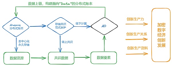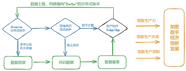 综上所述,Arweave 已摆脱仅仅基于 Token 的发展框式,实现从数据资源到共识数据,再到数据要素的演进。在 SCP 支持下,Arweave 突破了传统束缚,创造了新的数据生产资料,带来了大规模高性能算力的生产力,并在数据的流通、交换、生产、消费、价值分配的过程中,重构了主体间的生产关系。Arweave 有望为加密行业的创新发展带来全新动力,构建起真正的加密数字经济体系。