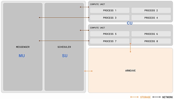 这是一个模块化架构,不仅计算与存储分离,且 MU、SU、CU 以及 Arweave 是相互独立的模块,但又相互联系和相互作用。