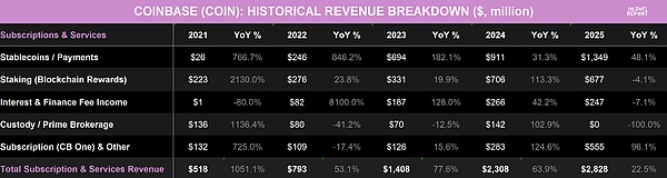 稳定币现在是该板块中最大的单一收入来源,预计到 2025 年将增长至 13.5 亿美元——较 2021 年增长 52 倍,占 2025 年总收入的 19%。这些收入主要来自 Coinbase 与 Circle(USDC)的合作关系。根据合作协议,Coinbase 可获得 Coinbase 平台(包括交易所、Prime 服务和托管服务)上所有 USDC 收入的 100%。此外,Coinbase 还获得平台外所有 USDC 持有量(其他交易所、DeFi、钱包等)「剩余」储备收入的 50%。总而言之,通过这项合作,Coinbase 获得的收入超过了 Circle 总收入的一半。