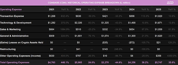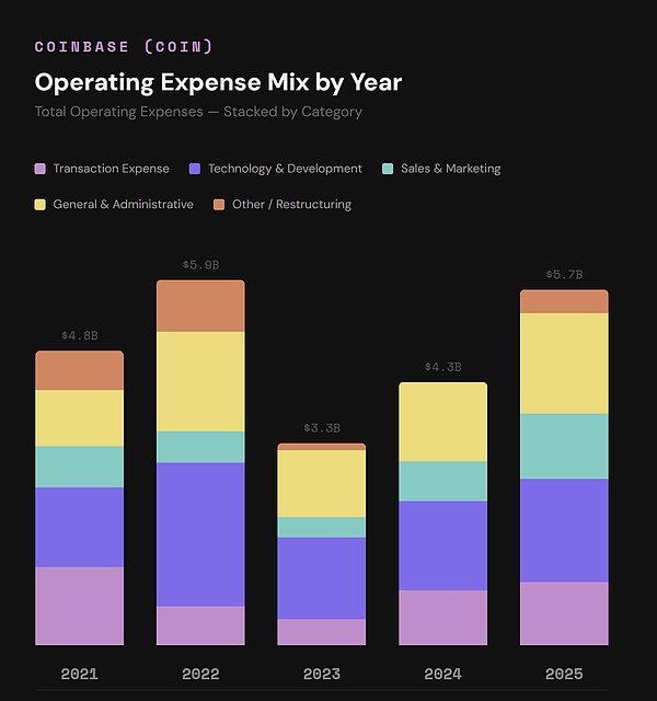 其余 57.3% 的收入来自技术与开发部门(2025 年增长了 13.8%)以及一般及行政费用部门(2025 年增长了 24.6%)。鉴于 2026 年预计收入将会下降,我们认为 Coinbase 可能会再次削减员工人数,以在熊市期间降低运营成本。