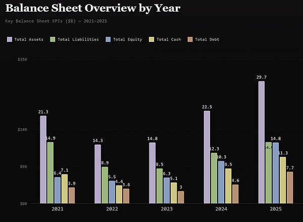 资产情况:除现金外(这是其有史以来最大的一项资产),Coinbase 通过收购 Deribit 获得了 42 亿美元的商誉,拥有 20 亿美元的加密货币资产(包括比特币和以太坊),6.23 亿美元的战略投资(其中包括对 Circle 的持股),以及 3.1 亿美元的可交易投资。另有 33 亿美元为运营资产(应收账款、贷款、设备)。2025 年资产负债表上最重大的变化来自于对 Deribit(一家领先的衍生品交易所)的收购。由于此次交易,其商誉从 11 亿美元猛增至 42 亿美元,无形资产也从 4700 万美元飙升至 14 亿美元。